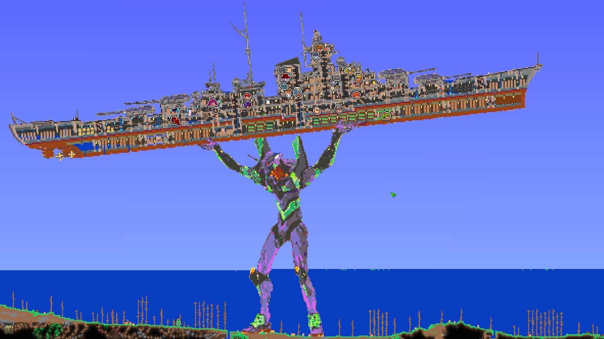 Terraria doesn’t get the same level of fanfare as Minecraft, but its two dimensional crafting is nevertheless responsible from some truly impressive player-made creations of its own. Behold the latest: an Evangelion lifting a warship over its head. The above screenshot, which has been blowing up on the Steam community pages and was first spotted…