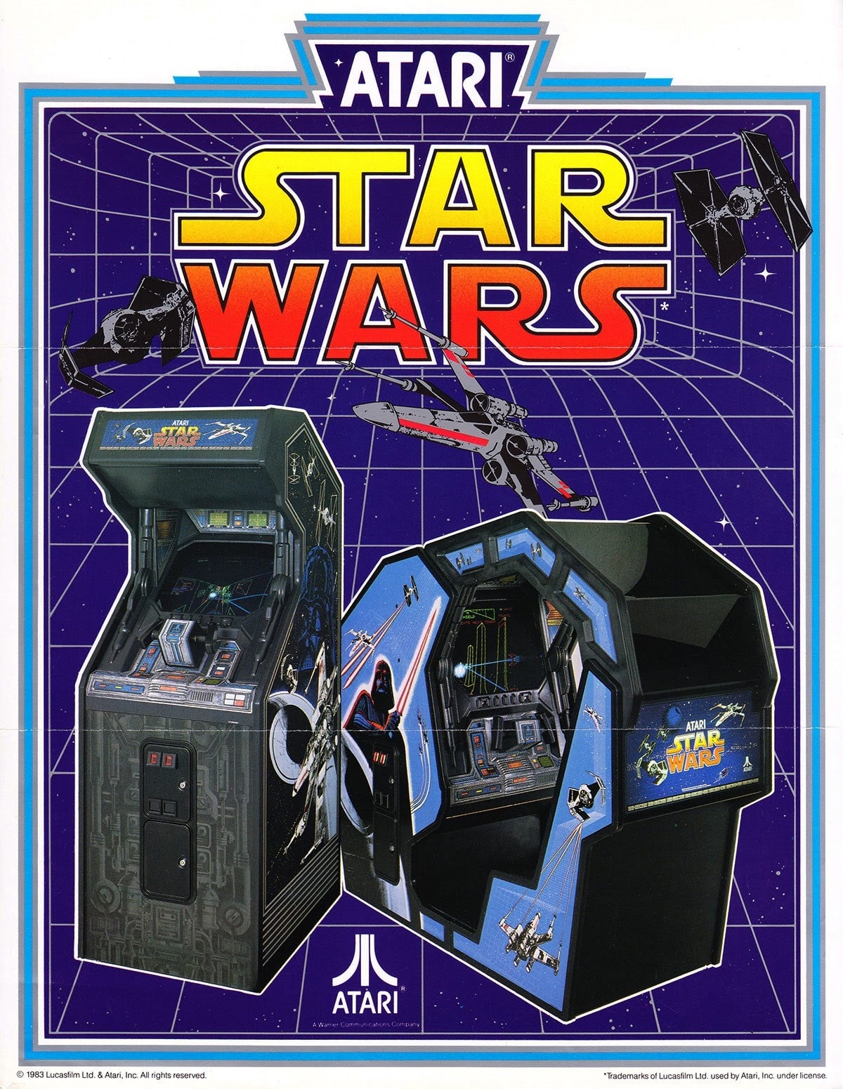 Released in 1983 in both standup and cockpit configurations, Atari’s Star Wars game was a unique presence in ‘80s arcades, shopping centers, and movie theater lobbies. The cabinet drew the eye, with dueling X-wings and TIE Fighters framingthe iconic logo. Voice samples from actors Harrison Ford, Mark Hamill, Alec Guinness, and James Earl Jones lured players in, along with the growls of Chewbacca and the beeps of R2-D2.