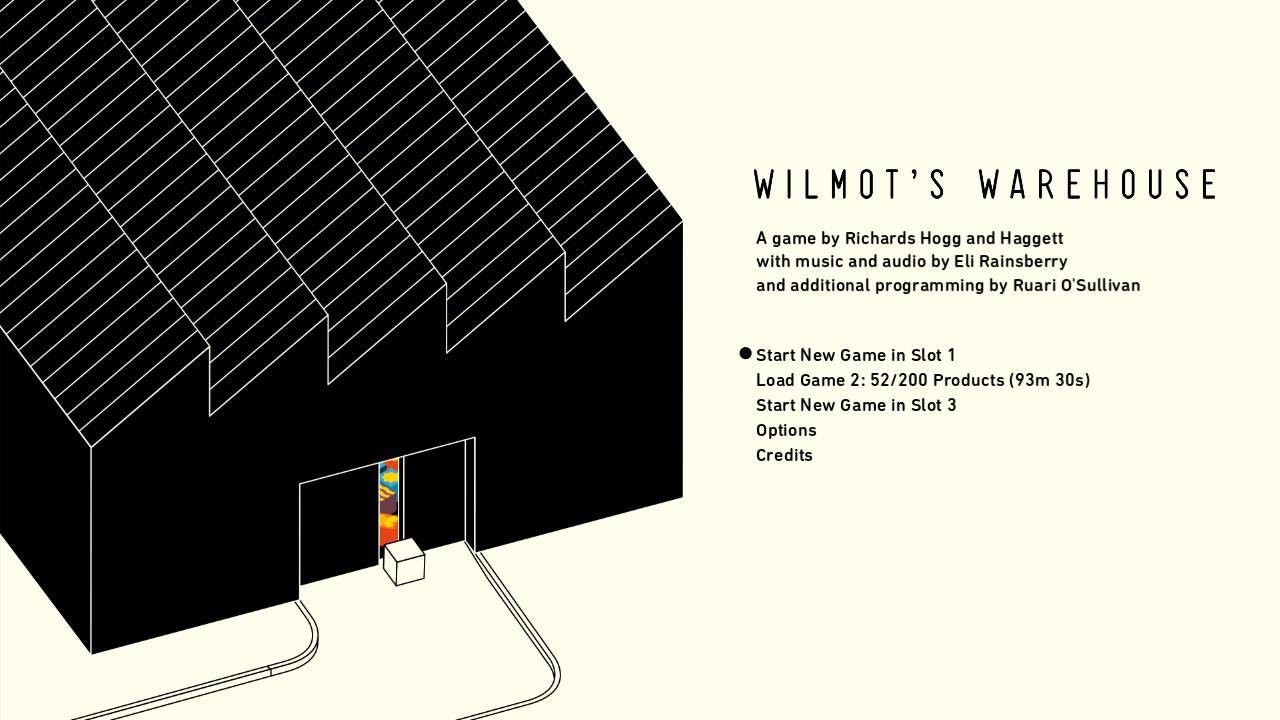 There is not much going on in the Wilmot’s Warehouse title screen, and that is why I like it. The art style is almost drab, like a safety manual—but get a load of what’s behind those doors! What could that whimsy be? Let’s play and find out!